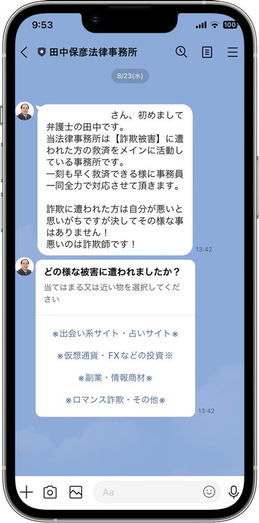 副収入を得ようとした情報を仕入れていたところ、SNSで有名人が投資の募集していたのでLINE登録登録し、つながった美人女性から委託運用を紹介され、彼女の勧めに従い、特定の口座に資金を預けました。彼女の約束通り、最初の数ヶ月間は預けた資金から毎月5%の利益が出ました。しかし、資金を増やすように言われ、さらに数百万円を追加投資しました。その後、資金を引き出そうとしたところ、「取引の確定には手数料が発生する」や「税金が未納」などと言われ、思いがけない追加費用を支払う羽目になりました。結局、追加で支払った費用は回収できず、資金を引き出すこともできませんでした。田中保彦法律事務所に相談したところ、スキーム全体が詐欺であることが判明しました。専門家の手により、詐欺師の巧妙な罠を見抜くことができました。今では、事務所の皆さんの支援を得て、失った資金を回収するための行動を共に進めています。このような困難な状況に立ち向かう力をくださり、心から感謝しています。